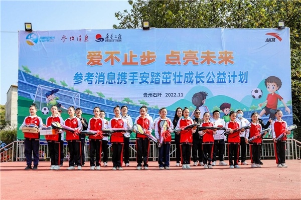 2022年11月9日贵州省石阡县,安踏茁壮成长公益计划(以下简称“茁壮成长”)联合参考消息报社走进贵州省铜仁市石阡县枫香仡佬族侗族乡九年制学校(以下简称“枫香九校”),并举行捐赠仪式。仪式上,安踏集团捐赠贵州省石阡县共计150万现金及物资,包含了安踏装备包、安踏体育课和安踏运动场,用于改善当地青少年体育教育及体育设施,是安踏茁壮成长公益计划年度帮扶计划重要的一站。