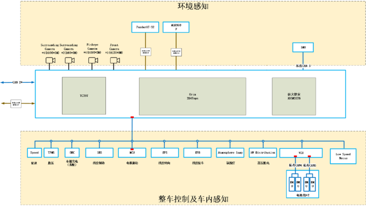 因此,新石器采用1个禾赛32线激光雷达作为主雷达、1个棱镜式激光雷达作为补盲雷达,同时在车辆前后左右采用6个环视摄像头进行目标感知。此外,新石器还采用了1个120°前视摄像头进行信号灯、车道线以及交通标识的感知,同时在四周部署了4个鱼眼摄像头作为安全保障。由于目标及环境感知的模型较为复杂,算力需求大,所以新石器更是自主研发基于异构架构的智能驾驶计算平台Neowise,通过集成算力达到254Tops的NIVIDA Orin芯片,搭建起一个更优的智能驾驶系统硬件架构,为无人车自主感知及自动驾驶保驾护航。