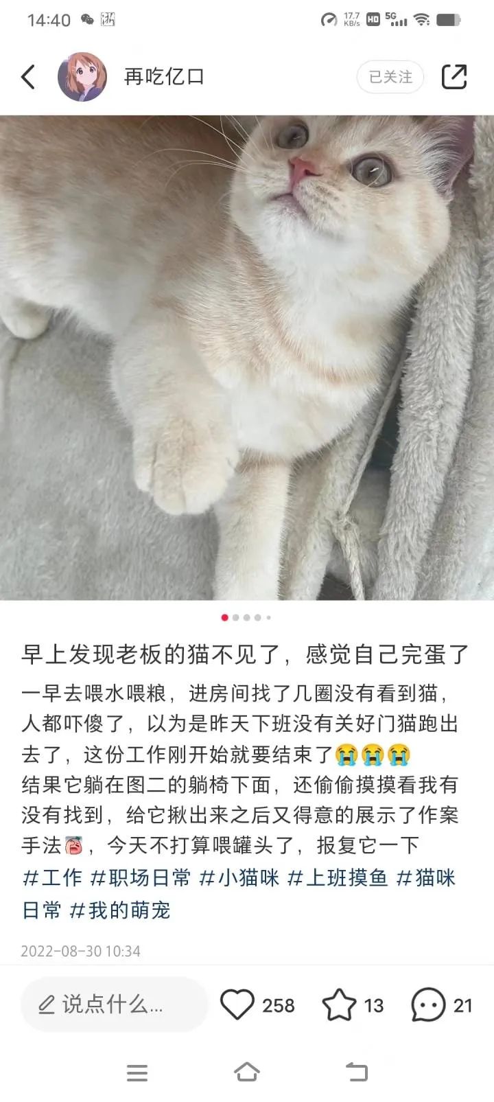 “带薪撸猫上过热搜的女人,希望老板做大做强,争取全国养猫。”打着戏谑的个人标签,刘慧时常在社交账号上分享自己给猫当保姆的日常,引发了近百万人的在线围观。