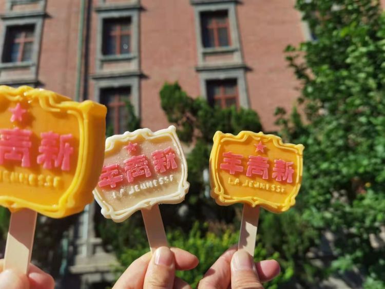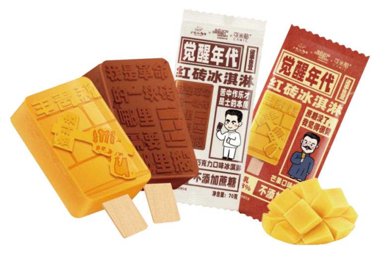 其中,觉醒年代IP的文创冰淇淋一跃成为“网红”产品。“我是革命的一块砖,哪里需要哪里搬”和“新青年奋斗去”的励志标语,结合独特的红砖造型,加上剧中角色经过二次创作的卡通形象,正能量与幽默并存的风格迅速拉近了与年轻人之间的距离,一跃成为“网红”冰淇淋。
