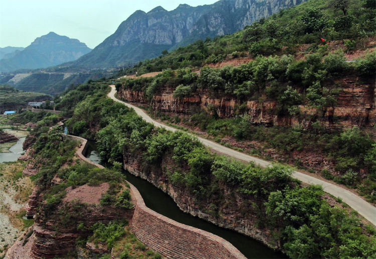红旗渠蜿蜒起伏,如一条巨龙盘旋于巍巍太行山脉。