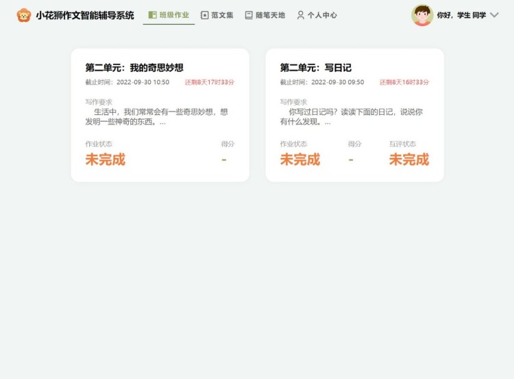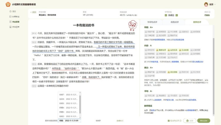 “小花狮”的教师端是一个智能化的教学辅助平台,系统支持教师设置单元习作任务、小组互评任务和合作式写作等教学活动,在系统自动给出智能初评意见后,教师可以进一步通过点选标签、新增评价和语音点评等方式快速地复批作文,还可以查看学生修改历史记录,设置优秀范文和打印在线批改结果等。“小花狮”的学生端则是一个智能化的学习测评平台,系统支持学生即时拍照上传作文、智能化自动评阅,进行学伴互评互改、查阅优秀范文和查看学情变化趋势等,帮助学生快速地定位写作错误和难点,在自我修改和相互修改的过程中提高写作能力。