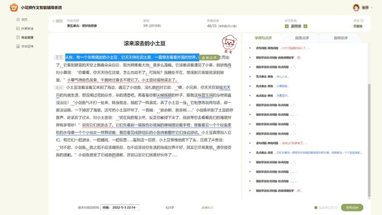 “打开作文,拍照上传,等待一小会儿,我们就能看到‘小花狮’给出的作文批阅结果啦!蓝色划线的是识别出的写作亮点,红色划线的是识别出的待改进部分……”随着现场工程师的演示操作,一篇小学四年级作文《新龟兔赛跑》在十秒左右的时间里,就完成了图文识别转换的过程,并迅速给出了作文的智能化测评结果,其中包括6处字词句错误和4处写作亮点——这是发生在2022年世界人工智能大会教育论坛的展台体验区的一幕。这款名为“小花狮”的中小学作文智能辅导系统,是由华东师范大学和微软亚洲研究院联合研发推出的智能化教辅产品,旨在推动中小学作文基础教学的数字化转型,服务一线语文教师和广大中小学生。