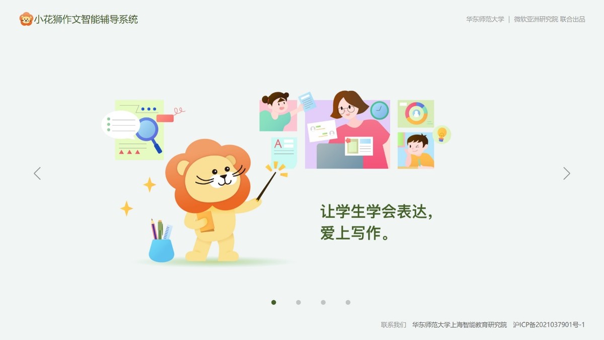 发展有温度的智能教育,是华东师范大学和微软亚洲研究院在面对人工智能时代教育变革的使命和初心。“小花狮”作文智能辅导系统将始终以服务一线师生为宗旨,以培养学生的语文核心素养和中文写作能力发展为目标,在智能技术辅助教学和教育数字化转型的领域中探索前进,努力为发展有温度的智能教育贡献自己的力量。