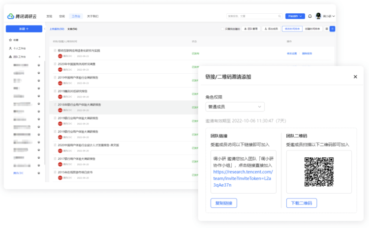 腾讯调研云支持快速建立调研团队,一键邀请成员加入,提升团队协作效率。同时,通过调研云,调研团队可以对研究成果、知识经验进行统一上传管理,无须零散地存放本地或云盘,支持自定义内容标签化分类、设置可见范围、是否公开及下载等权限,告别研究经验复用难与协作效率低的困境。