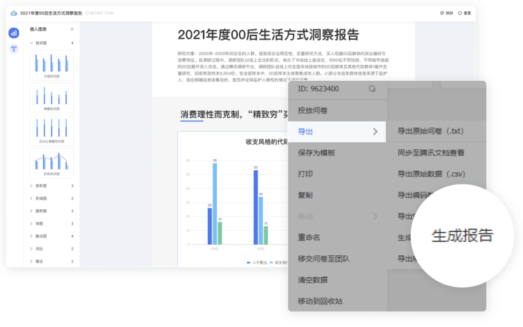 为进一步提升调研产出效率,腾讯调研云联动腾讯问卷,实现上下游调研数据打通。调研团队通过腾讯问卷进行编辑、投放、回收数据后,可以将调研结果快速导出至调研云,自动生成分析简报。