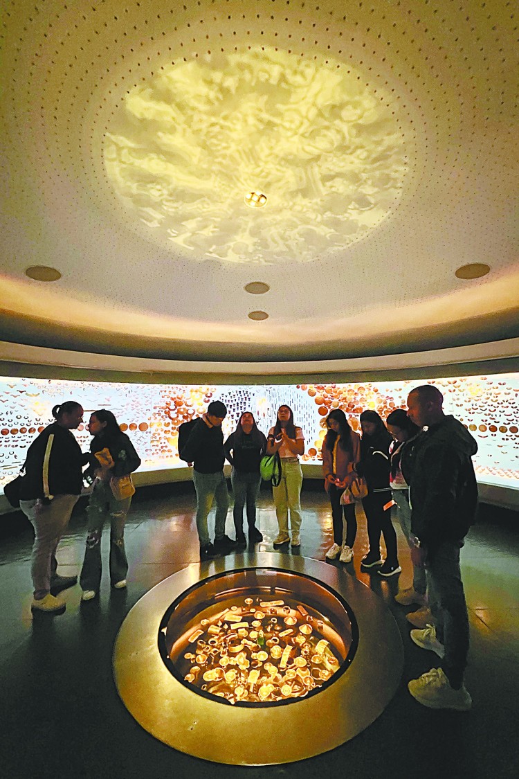 博物馆二楼和三楼的展厅陈列着前哥伦布时期穆伊斯卡文明各个阶段的黄金器物,如琼巴亚、卡利玛、泰罗纳、泽努、梅伊斯卡、托里玛和纳里诺等各个时期,制作风格迥异,壮观夺目。四楼每天有两场介绍开采黄金的纪录片,通过影片可以了解黄金冶炼的过程,每件金品的背后都浸透着古印第安人付出的血与泪。