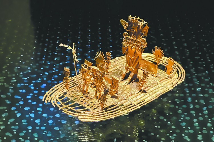 穆伊斯卡黄金筏是黄金博物馆的镇馆之宝,蜡融法铸造的经典之作。1969年,人们在马格达莱纳河岸附近的洞穴内发现一只金筏,经考古专家认证,这只金筏是金银铜合金的祭祀品,制作于13世纪至15世纪的穆伊斯卡文明时期。金筏上雕刻的人物及场面,与埃尔多拉多传说中黄金人的就职仪式相似,因而备受关注。