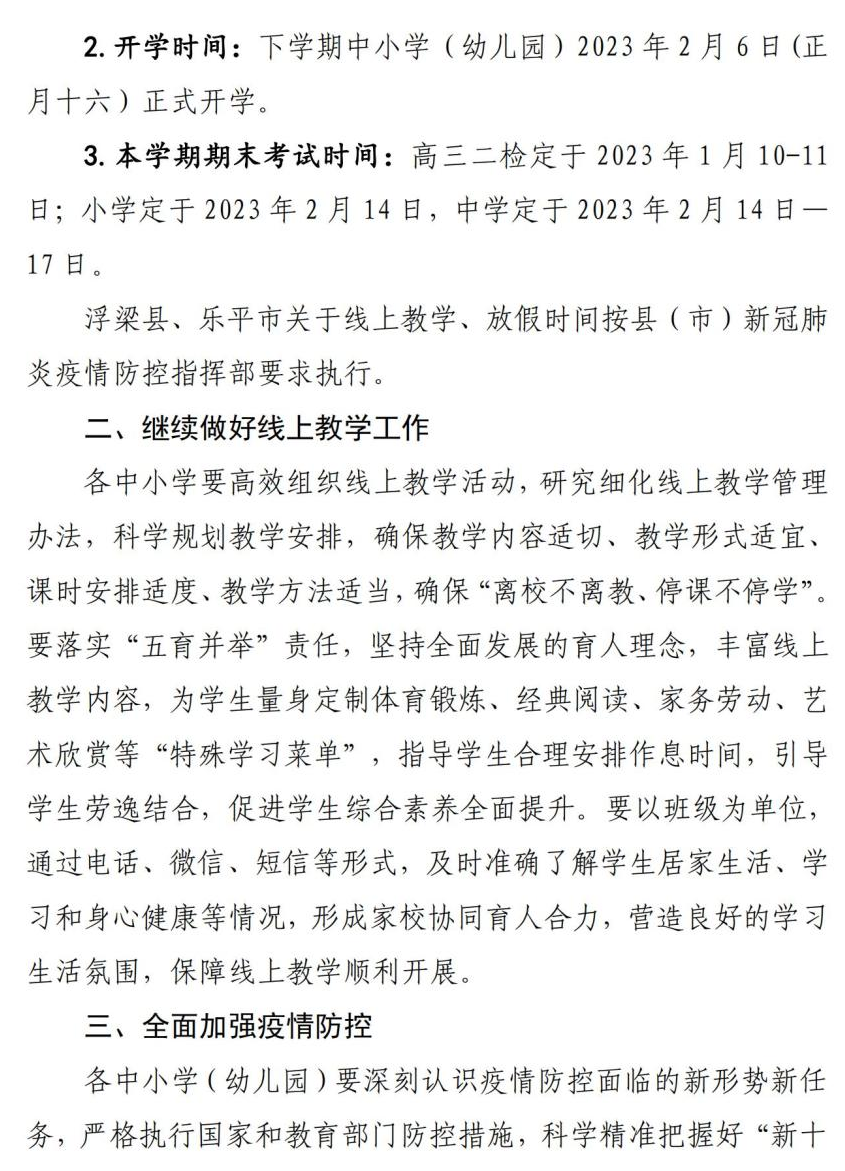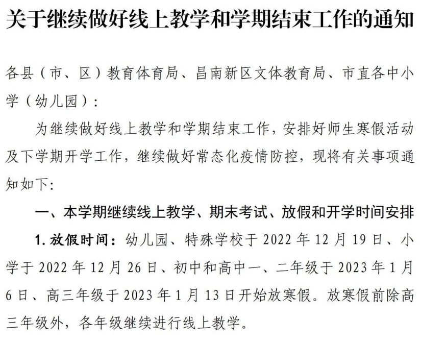 幼儿园、特殊学校于 2022 年 12 月 19 日、小学于 2022 年 12 月 26 日、初中和高中一、二年级于 2023 年 1 月6 日、高三年级于 2023 年 1 月 13 日开始放寒假。放寒假前除高三年级外,各年级继续进行线上教学。