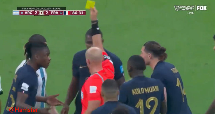 比赛的第86分钟,法国队员图拉姆在阿根廷队禁区内摔倒,裁判认为是假摔,给予黄牌。