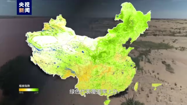 这12万亿像素记录着十年间荒漠化治理的过程,在这张植被指数差值图上,绿色代表覆盖率上升,它们越过了黄河,攀上了高原,穿过了沙地,为中国版图贴上了一块块生机盎然的像素。