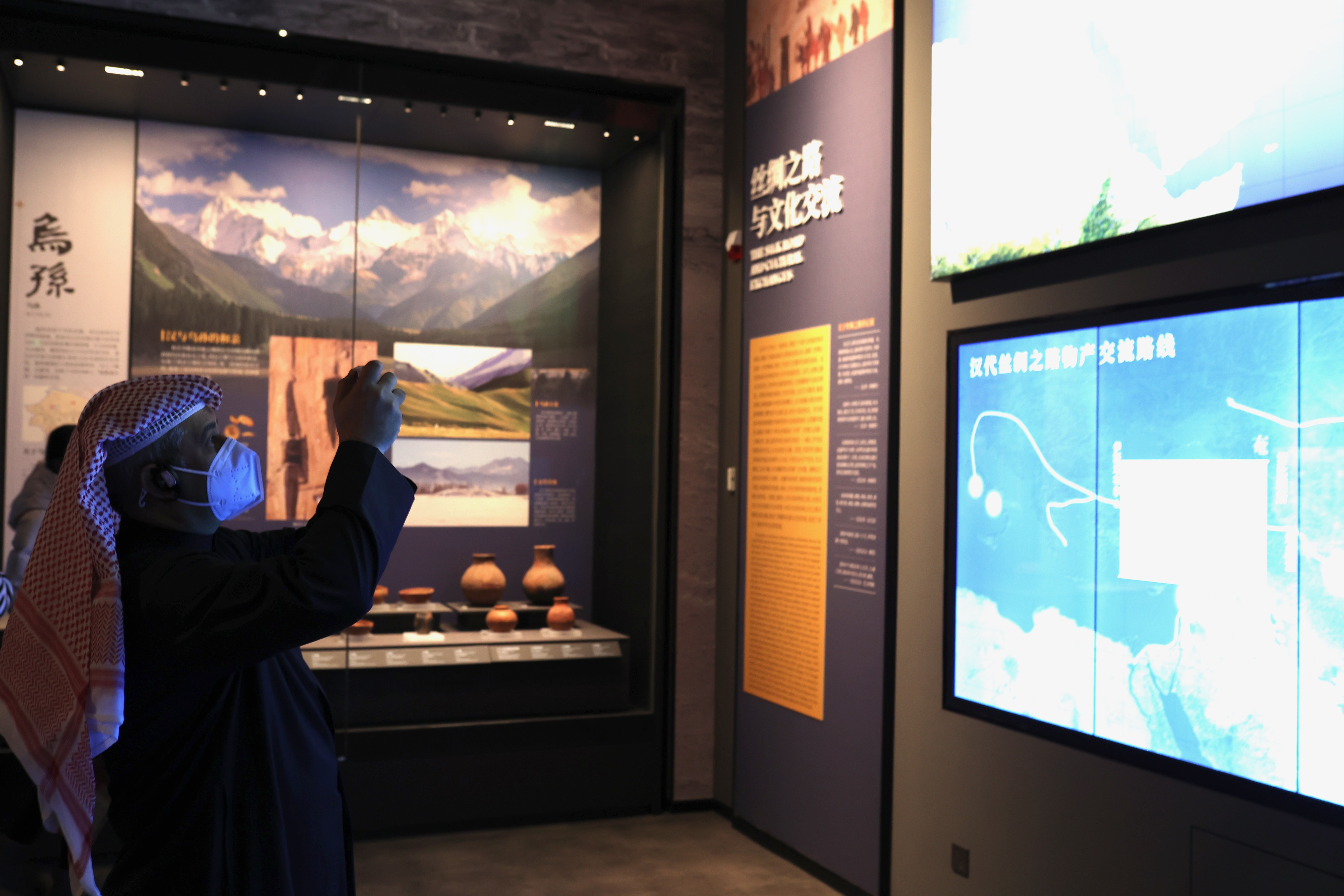 新疆维吾尔自治区博物馆是代表团的第二个参访目的地,中国新疆悠久而包容的文化显然让代表团成员着迷。在“西域人科举入仕与文化交流”板块前,几名代表团成员驻足良久,他们对高昌故城遗址出土的一份汉文佛经译本很感兴趣,还反复辨认着并排陈列的一份《世界征服者史》波斯文抄本。在参观完博物馆后,代表团成员还观看了新疆维吾尔传统艺术十二木卡姆的表演,他们纷纷拿出手机记录精彩瞬间。