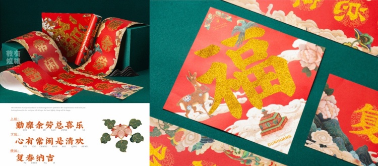 2023复春礼产品共分为两层,第一层包含桃符+复春册,第二层囊括春联、福字、红包、月历、笔记本等春节用品。礼盒中的每一件好物,设计灵感也均来自敦煌莫高窟这座“沙漠中的美术馆”,取材于石窟壁画中的祥瑞图案,藏经洞遗书中的经典文献和考古出土的文物珍品。将古老的莫高艺术结合吉祥寓意及美好祝愿,经过精湛工艺的呈现,将敦煌的心意与祝福传递与每个人。