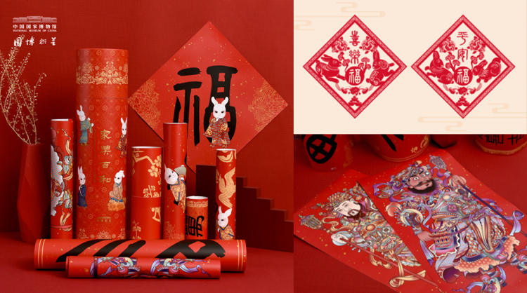 “万喜毕集2023新春礼盒”中,新春对联、红包、国博日历、门神等一应俱全。其中窗花绘有玉兔、牡丹与如意灵芝,门神则由插画师用国风水墨工笔手法绘制,分别展示威风凛凛和福禄丰登之象。值得一提的是,礼盒的手提袋花纹来源于明代文物清华缠枝花卉纹折沿盆,提取该文物外壁所绘的缠枝牡丹纹为图案,寄寓新的一年富贵无虞,吉祥兴旺!