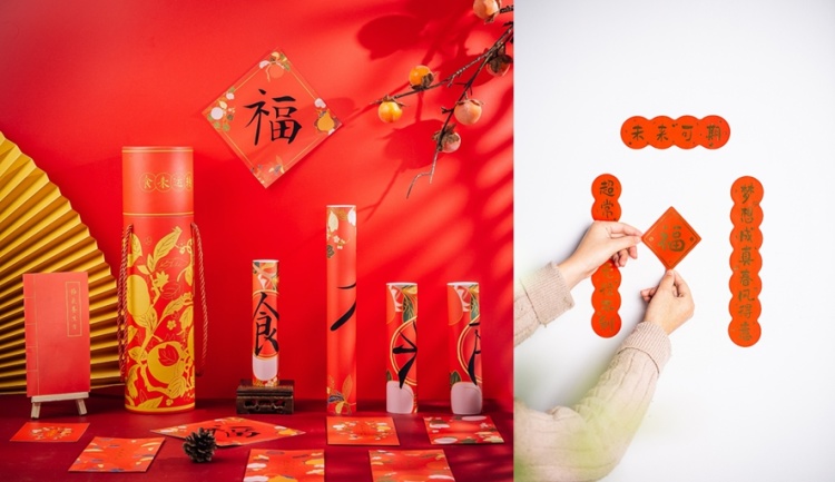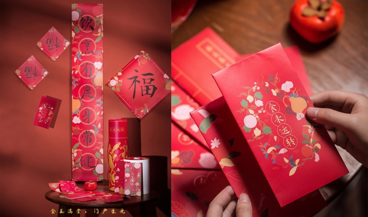 “食来运转”福筒年礼中的对联皆为古籍《食物本草》楷书集字而成,传递古人顺时养生、健康饮食的生活理念。产品装饰纹样则精选自古籍中的明人手绘插图:葫芦,寓意“福禄安康、财源广进”;石榴,祝福“阖家幸福、金玉满堂”;花生,象征“福运当头、好事发生”;柿子,代表“事事如意、步步高升”。这四种吉祥图案装饰,寓意美好。