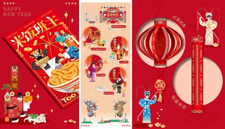 生动有趣的原创手绘插画场景,配以新年美好的祝愿,组成了这独具岭南韵味的对联套装。对联套装主视觉由粤剧五大行当“生旦净末丑”延伸而来,通过表现不同时期的拜年习俗,比如早年的磕头作揖拜年,近年的网络拜年、电子红包等,展现的是新年喜气洋洋的热闹氛围更体现了粤港澳大湾区这些年蓬勃发展,积极向上、勇于创新的精神面貌。