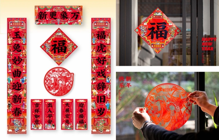 “家兴百和小福筒”里的“瑞兔贺春”图穿插在对联、福字等各个角落,为新春氛围更增添一份灵动趣味,传递阖家团圆的美好期盼,也为癸卯年的到来聚财得瑞,迎祥纳福。
