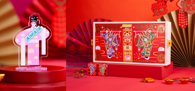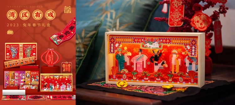 广东省博物馆文创团队以大湾区共同的文化记忆“粤剧”为主题,打造 2023“湾区有戏”新年礼盒,以创新形式表达经典的传统戏曲,传承非遗粤剧文化,展现人文湾区新活力。