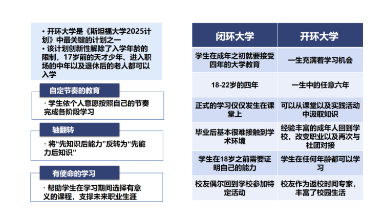 在斯坦福大学,有一个著名的《Stanford 2025》计划,它的设计,完全颠覆了我们对高校的认知。常规情况下,想接受大学教育,需要在大约18岁时考入一所学校,并在这里完成四年的学习。而在开环大学,入学者可以是18岁的高中生,可以是已经进入职场的中年人,甚至可以是头发花白的老年人。学习时间不是固定的,学习场所不是固定的,学习方式也不是固定的。