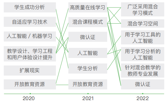 美国高等教育信息化协会(EDUCAUSE)每年都会发布一份《地平线报告》。可以看到,混合学习模式和混合学习空间是高等教育发展的关键趋势之一。需要注意的是,混合学习,并不只是线上和线下学习的混合,也是正式和非正式学习的混合。只有进入到非正式学习,才是真的进入到了以个人为主导的终身学习。