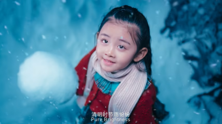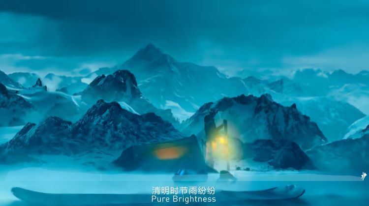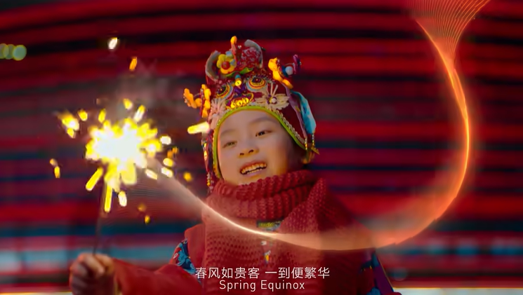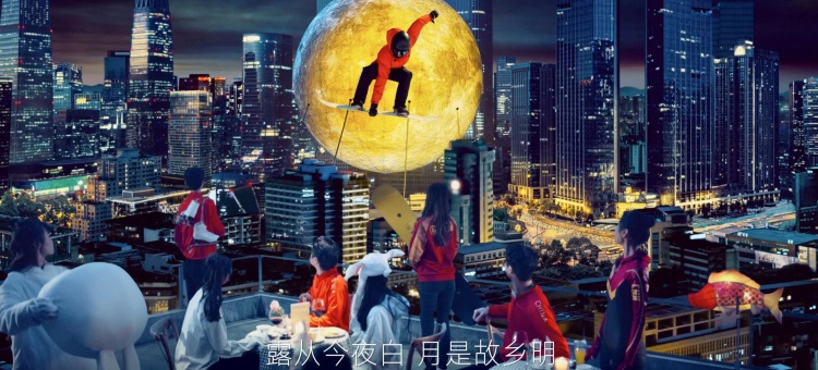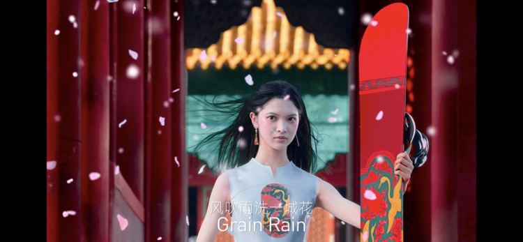 “春雷响,万物长”,惊蛰节气物候里是生命萌动的景象,短片镜头里中国高铁从隧道涌动而出,蓝色水滴无人机在赛博都市逆地而起,展现的是中国现代化发展的全新面貌。“清明时节雨纷纷”,雪山、帐篷、滑板和滑雪者出现在“雪纷纷”画面中,却让人不禁联想起江南烟雨蒙蒙的氛围。谷雨时节“风吹雨洗一城花”,紫禁城的漫天飞花里,国潮女孩昂扬着年轻人的文化自信款款而来,她手中的滑板上描绘的是朱雀、祥云等传统吉祥纹样,古典与未来交融出深邃的文化景象。