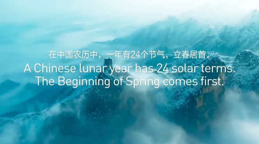 用脍炙人口的古老诗词串起整支短片,也是张艺谋导演一直坚持的理念。最初听到这个想法时龙江波内心也有困惑,短片中每个节气的展示时间只有几秒,他很担心用视频画面配诗词文字的形式,会拍出业内诟病的“看图说话”式的效果。但张艺谋导演却不以为意,告诫他“不要被行业里前人提出的观念所约束。即便是‘看图说话’,但如果你的段位足够高,也可以开创出属于你自己的一个新风格。”