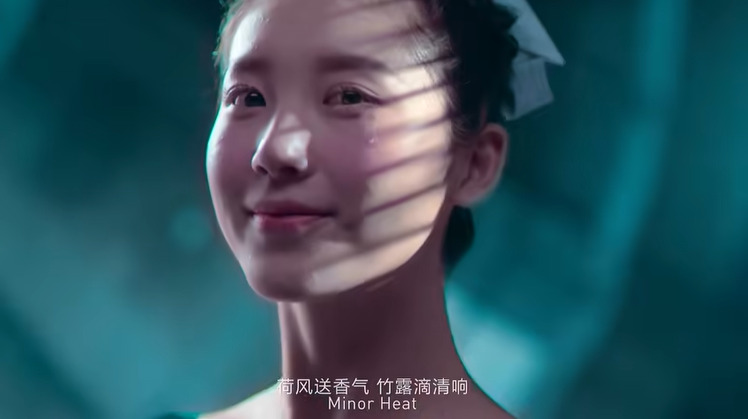 夏至恰是“采莲时”,拍摄的是花滑运动员训练时的状态,裙裾飞扬犹如冰面上绽放的荷叶莲莲美景,与诗句“绿筠尚含粉,圆荷始散芳”的意境浑然天成。小暑节气则进一步对花滑运动员完成高难度动作之后喜极而泣的瞬间作特写,“她的眼泪滴下来时就像一颗露珠打在荷叶上的感觉,与诗词‘荷风送香气,竹露滴清响’所呈现出来的画面意境一脉相承。”龙江波诠释。