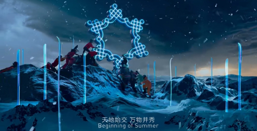 三分半钟的短片以优美诗句串起二十四节气,浓缩呈现了祖国新时代的新变化。"古诗词诠释节气,观众品味到的是中国传统文化,但看见的又都是冬奥会上冰雪竞技的精彩运动画面,而感受到的则是中国人在传统哲学思想里对世界对未来的态度。”龙江波感慨,古诗新解这一创作思维的打开和提升,“是把难点变成特点,成就了短片最为独特的地方。”