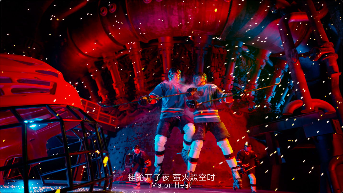 最绝妙的是大暑节气的创意,“桂轮开子夜,萤火照空时”的诗意下,以冰球运动员热火朝天的训练场景表现大暑时节的炙热感。“他们碰撞在一块儿,就像钢铁和钢铁碰撞在一块,火星四溅、热情澎湃!我们拍的是冰球运动,但你看到的是热情肆意的年轻力量碰撞的感觉。”龙江波说。