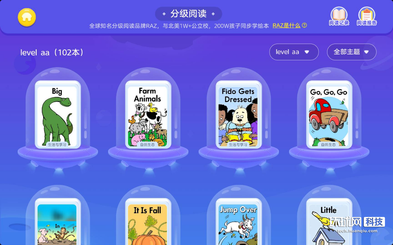 针对孩子英语阅读的启蒙教育,这款学习机还设置了Raz-Kids分级阅读版块。这里大家可以看到包括生活与学习、自然生态、做人做事等6大内容主题,在幼儿阶段就能支持到这么全面而丰富的阅读资源,这款产品在启蒙资源上还是比较给力的。