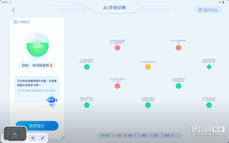 这一张生成的知识图谱上,还可以直观地看到我们的得失分情况,还采用了红、黄、绿三种颜色区分孩子对知识点的掌握程度。学习机还能结合诊断结果,规划出适合孩子的学习路径,让孩子只需要学习未掌握的、适合其学习的知识点,找准发力点,最大程度减少学习的无用功。