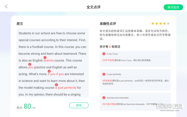 其中,英语作文助手功能,能够以中高考同源的评分要求,从准确性、完整性、流畅性三个维度进行专业打分与点评。我们在网上找了一篇高考英语作文让学习机进行批改,可以看到学习机能够快速地识别出作文里出现的书写不规范、词性错误等问题,连句子成分残缺也能清晰指出来。