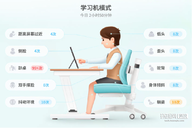 提到学习机,离不开家长们最为重视的健康守护功能。这次的T20 Pro在护眼和坐姿提醒上都做了升级优化,支持侧脸、趴桌、双手撑脸、低头等10项不良检测项,打开讯飞AI学手机APP的健康坐姿提醒选项,开启坐姿守护,就能够实时检测孩子的不良姿势。