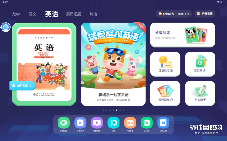 先来看英语启蒙。英语启蒙核心就是瑞恩熊AI英语功能,跟传统枯燥的“死记硬背”式学习不同,科大讯飞AI学习机的瑞恩熊英语以卡通动画和闯关的趣味形式来进行课程设计,这个看起来还是挺有趣的,幼儿阶段孩子就喜欢这样比较童趣的形式,在玩耍中潜移默化地接受英语启蒙教育,也有利于培养孩子对英语学习的兴趣。