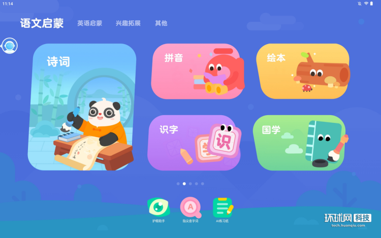 首先来看幼儿学段的界面,整个界面和图标设计萌趣可爱,画面风格也更吸引幼儿阶段的孩子,很大程度降低孩子学习时的排斥心理。主界面有语文启蒙、英语启蒙和兴趣拓展三个选项。幼儿阶段的孩子正处于兴趣开发启蒙阶段,最重要的是培养他们的学习兴趣,而语文、英语的启蒙学习在幼儿时期更显得格外重要。