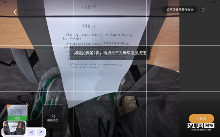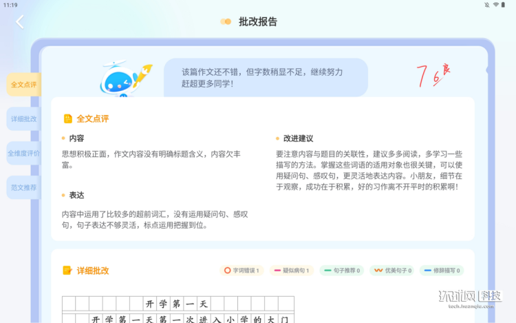 自主学习这块,我们还实际体验了T20 Pro的Al作文助手功能。参考小学阶段作文要求,我们也撰写了一篇作文,直接拍照扫描,就可以让学习机来批改。