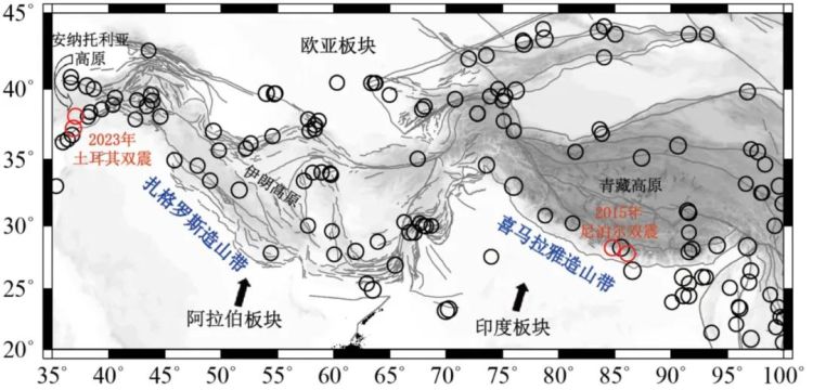 扎格罗斯-喜马拉雅造山带是世界上规模最大的大陆板块碰撞边界,印度板块和阿拉伯板块先后自南向北俯冲到欧亚板块之下,自东向西形成青藏高原、伊朗高原和安纳托利亚高原。扎格罗斯-喜马拉雅地震带又称“欧亚地震带”,横贯整个亚洲和欧洲。2023年土耳其地震发生在安纳托利亚高原和伊朗高原的过渡地带,位于东安纳托利亚左旋走滑断裂带上。