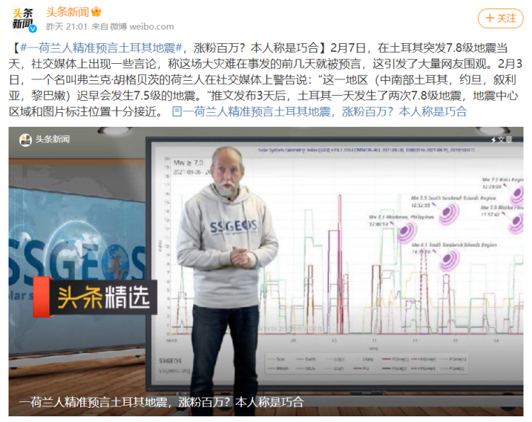 日前,在社交媒体上出现一些言论,称这场大灾难在事发的前几天就被预言,这引发了大量网友围观。此前,一个欧洲人在社交媒体上警告说:“这一地区(中南部土耳其,约旦,叙利亚,黎巴嫩)迟早会发生7.5级的地震。”
