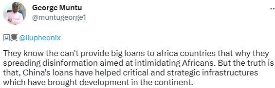 网友@George Muntu指出,他们(西方国家)知道不能向非洲国家提供大笔贷款,所以他们散布旨在恐吓非洲人的虚假信息。但事实是,中国的贷款帮助建设了关键和具有战略性的基础设施,这推动了非洲大陆的发展。