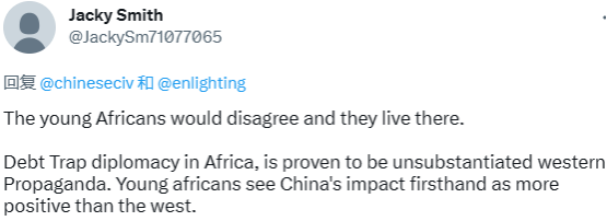 网友@Jacky Smith说道,在非洲的债务陷阱,被证明是未经证实的西方宣传。非洲年轻人更能够直观感受到,中国在非影响比西方积极多了。