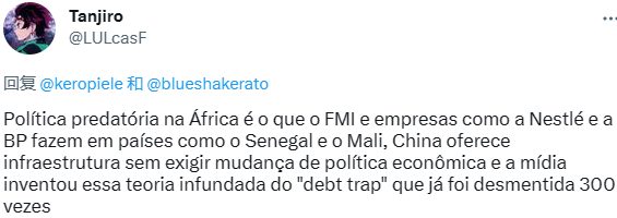 网友@Tanjiro表示,国际货币基金组织和雀巢、英国石油等公司在塞内加尔和马里等国家采取掠夺性政策,而中国向非洲援建基础设施却不需要改变非洲的经济政策,媒体编造这种毫无根据的“债务陷阱”论已经被否认300次了。