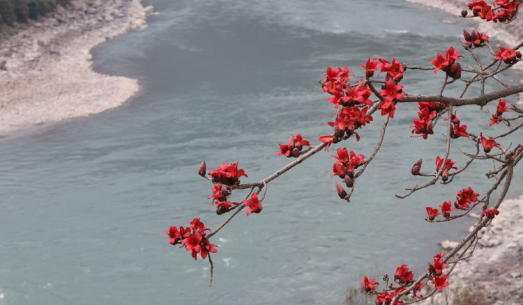 2月20日在云南省怒江傈僳族自治州泸水市怒江畔拍摄的木棉花。新华社发(梁志强摄)