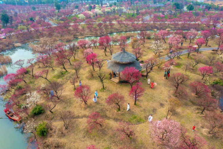2月19日,安徽省淮北市市民在南湖国家湿地公园梅园游玩(无人机照片)。新华社发(王文摄)