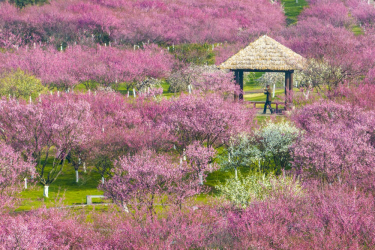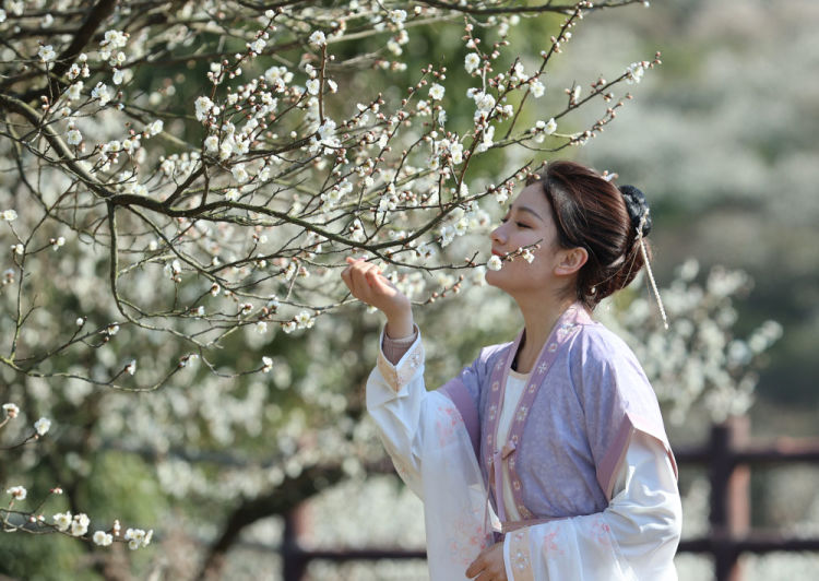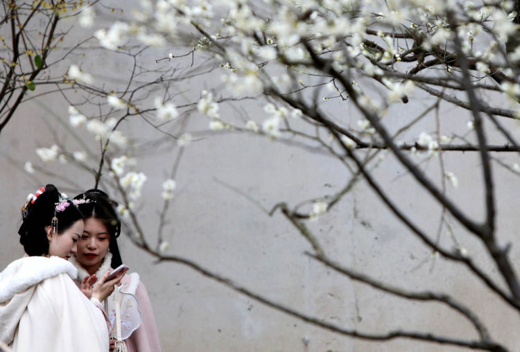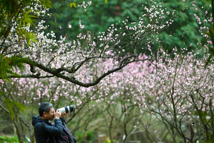 2月18日,游客在苏州市吴中区光福镇香雪海景区赏花拍照。新华社发(汤德宏摄)