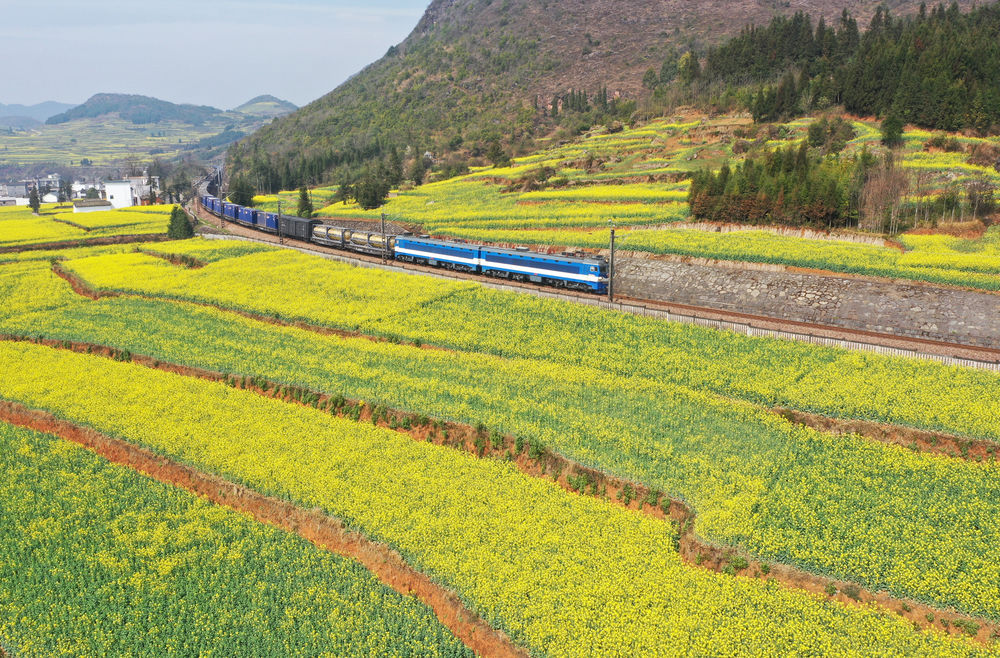 2月17日,一列火车驶过云南省罗平县板桥镇金鸡村的油菜花田(无人机照片)。新华社发(毛虹摄)