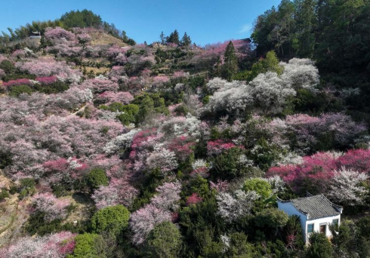 2月21日在安徽省黄山市歙县卖花渔村拍摄的梅花(无人机拍摄)。新华社发(施亚磊摄)