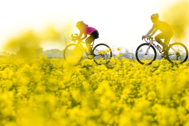 2月21日,骑行爱好者在江西省樟树市永泰镇官湖村油菜花海中骑行。新华社发(周亮摄)