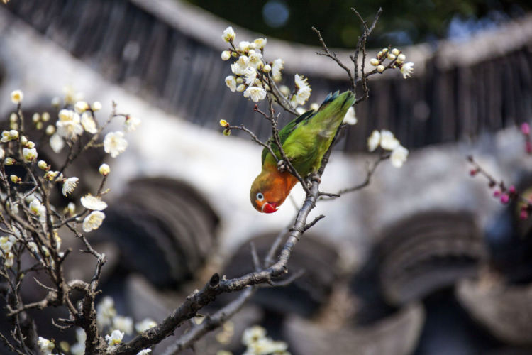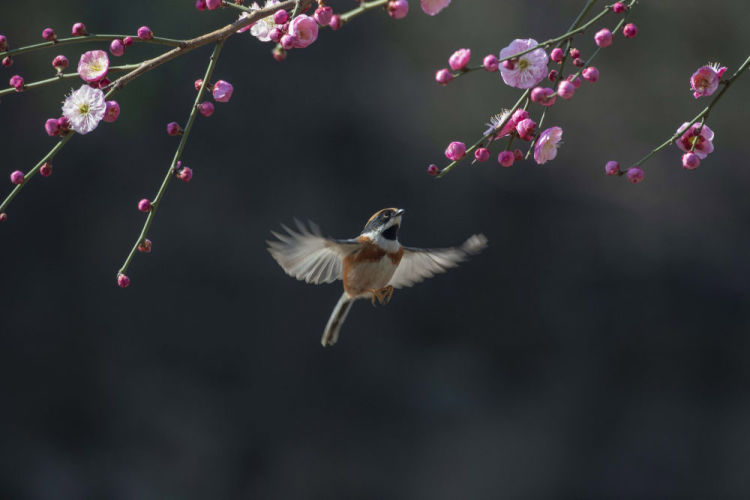 2月18日,在江苏省无锡市管社山庄,一只小鸟在梅花丛中飞舞。新华社发(潘正光摄)