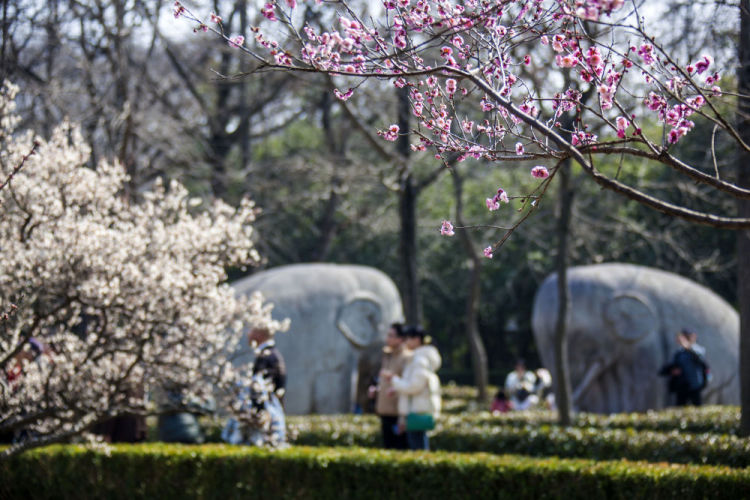 2月20日,游人在南京明孝陵景区神道旁赏花游玩。新华社发(孙忠南摄)