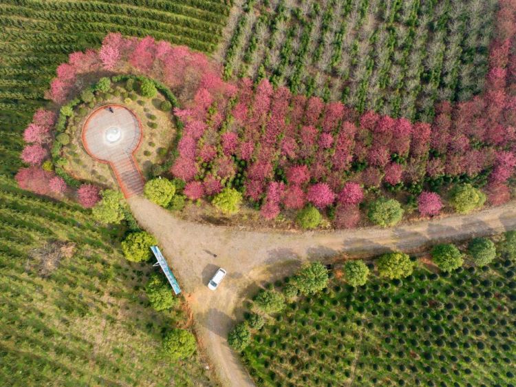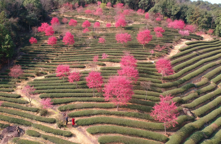 2月17日,游客在福建省南平市建阳区将口镇松柏村茶园中欣赏樱花(无人机照片)。新华社发(黄杰敏摄)